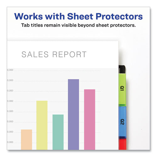 • Multicolored dividers have tabs tha