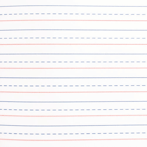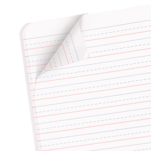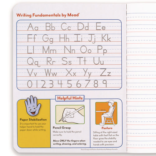 One subject composition notebook with ruled lines. Each page printed with solid and dotted line primary ruling for practicing writing the alphabet. Inside front cover includes manuscript alphabet for reference. Conforms to most handwriting methods. D