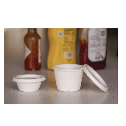 Molded fiber portion cup lids are excellent alternatives to traditional plastic portion cup lids. Sturdy and versatile, these lids securely fit the little containers that can handle both hot and cold items easily. Renewable and compostable. Fits: 2 o
