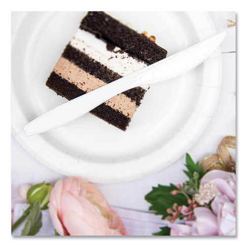 Affordably priced, strong cutlery with superior performance. Ideal for high-end takeout and upscale meal service. Utensils Type: Knife; Material Type: Plastic; Material(s): PS - Polystyrene; Color(s): White.