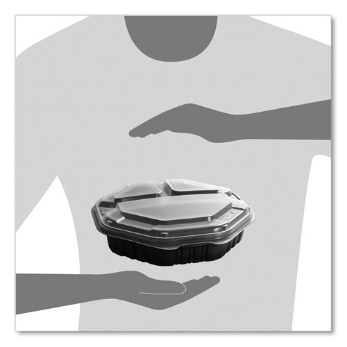 SOLO® OctaView Hinged-Lid Hot Food Containers, 3 Compartments, 38 oz, 9.55 x 9.1 x 2.4, Black/Clear, Plastic, 100/Carton