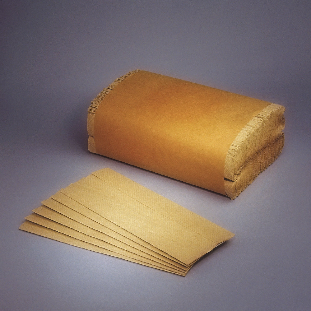 Kraft paper towel has a 4" deep fold and is 10-1/4" wide. Environmentally preferable. Made with 100% post-consumer recovered material. For use in bathroom dispensers. 200 per bundle, 12 bundles per box.