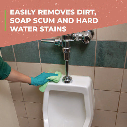 - Removes mineral-based soils, soap scum, and hard water stains.