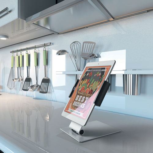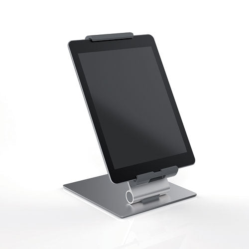 This premium-quality desktop tablet holder is ideal for use in offices, at reception desks, and in sales and exhibition environments. With its elegant surfaces and excellent stability, the desktop tablet holder is a great resource for presentations.