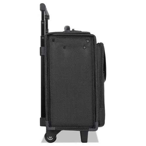 Features hanging file system. Removable fully padded 17.3" laptop sleeve. CheckFast sleeve design allows you to pass through airport security faster. Full size front zip-down organizer section and file compartment. Sturdy carry handle. Telescoping