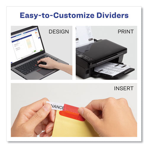 SKU: AVE11109 Manufacturer: AVERY PRODUCTS CORPORATION Mfr. Part Number: 11109 Brand Name: Avery® Alternate Part Numbers: AVE11109, AVE-11109, 11109, 40072782111098 (GTIN), 60072782111092 (GTIN), 00072782111090 (GTIN) Country of Origin: MX (MEXICO) TAA Compliant: Yes UNSPSC Code: 0044122008 Unit of Measure: ST (Set of 5) UPS Shippable: Yes Air Shippable: Yes Item Dimensions: 11.00 in. x 9.00 in. x 0.10 in. Weight: 0.1300 lb. Expiration Date: No Keywords: 5-Tab Style; Big Tab; Binder Index; Buff Dividers/Multicolor Tabs; Filing Accessories; Filing Supplies; Indexes; Inkjet Printers; Inkjet/Laser; Insertable Big Tab Dividers; Laser Printer; Multicolor; Ring Binder Divider; Subject Divider; Tab Divider; Tabs; Worksaver; Recordkeeping; Filing; Systems; Cataloging; Classification Environmental Properties
