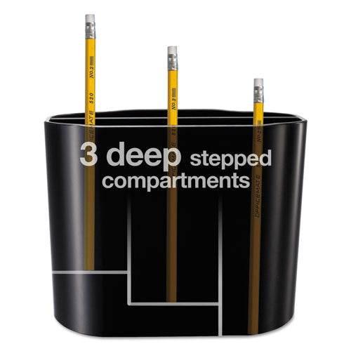 • Three deep stepped pencil cup allows easy access for pens, pencils, etc.